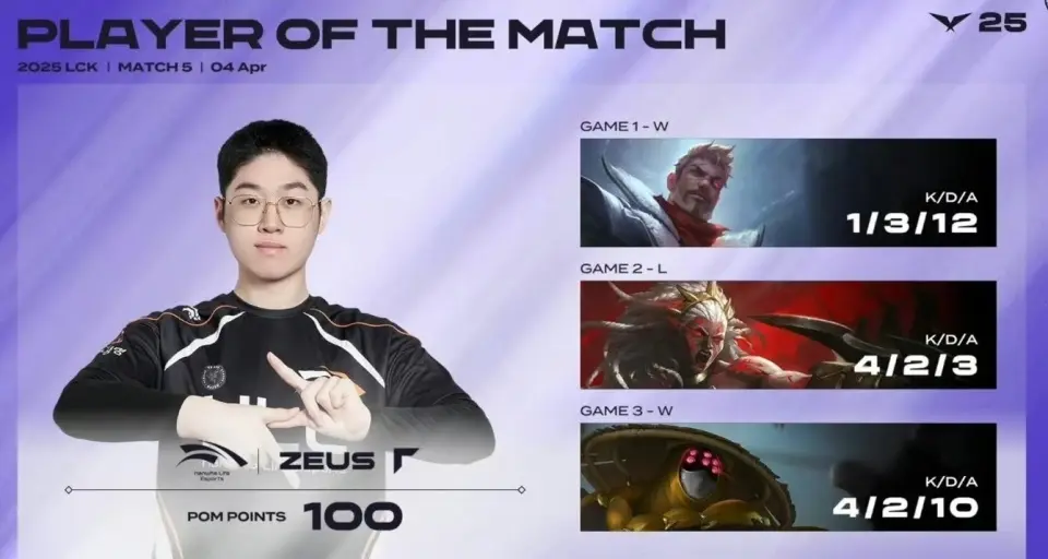 在这场HLE以2-1击败KT的BO3当中,上单Zeus的表现非常出色,他也拿下了这场系列赛的POG!在上一场打GEN的时候,他的竞技状态也不是特别好,尤其是在团战过程里,打的太着急反而一直给到对手机会!而在这场对阵KT的比赛里,基本都是他的个人秀,尤其是决胜局的武器,七进七出成为了对手的噩梦!同时他也达成了自己在LCK的生涯里程碑,拿到了1000次击杀(上一场打GEN的时候就只差几个了),他也来到了上单的第五位,目前上单第一的是Kiin1689次、第二的是Smeb1340次、第三的是Rascal1320次、第四的是Doran1318次。