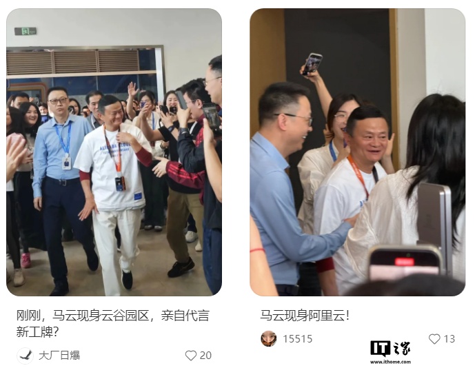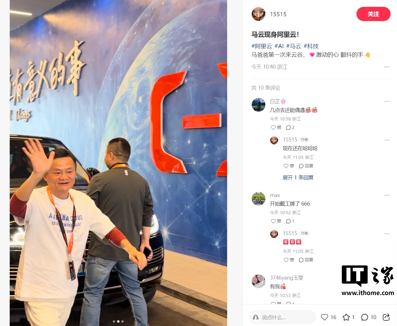 多位网友晒图称,阿里巴巴创始人马云今日现身阿里云谷园区。马云身穿白色 T 恤,衣服印有“Alibaba Cloud 15th Anniversay since 2009”字样。