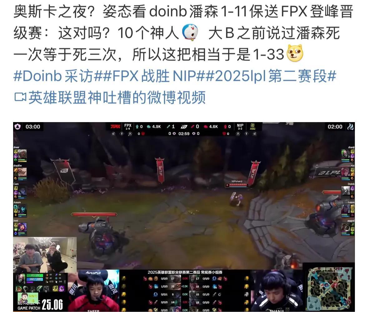 S15赛季的比赛已经正式开始了,相信绝大多数的玩家都关注了最近一段时间的对抗,Lpl赛区的比赛进行的是比较激烈的。小组赛的对抗结束之后,Nip战队成为了很多玩家关注的焦点,他们在确定晋级了登峰组的对抗之后,直接给fpx战队玩了一把大的,阵容BP开始乱选,中单更是拿出了最近版本根本不会使用的潘森,结果直接让对方的打野狗拿到了17-0的战绩,中单的潘森1-11,根据doinb之前的算法,直接来到了0.33-33。Lpl赛区的正式比赛再一次上演了奥斯卡之夜。
