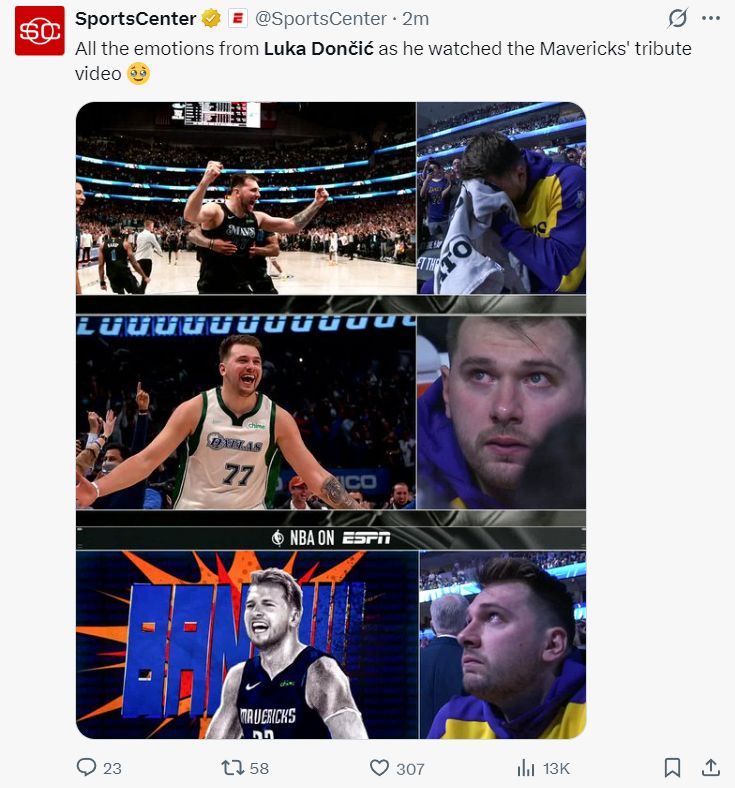 独行侠主场也为球队的大功臣进行了盛大的致敬仪式,除了板凳上的体恤还制作了精良的视频,东契奇看到这些视频后回忆涌上心头,他饱含热泪。