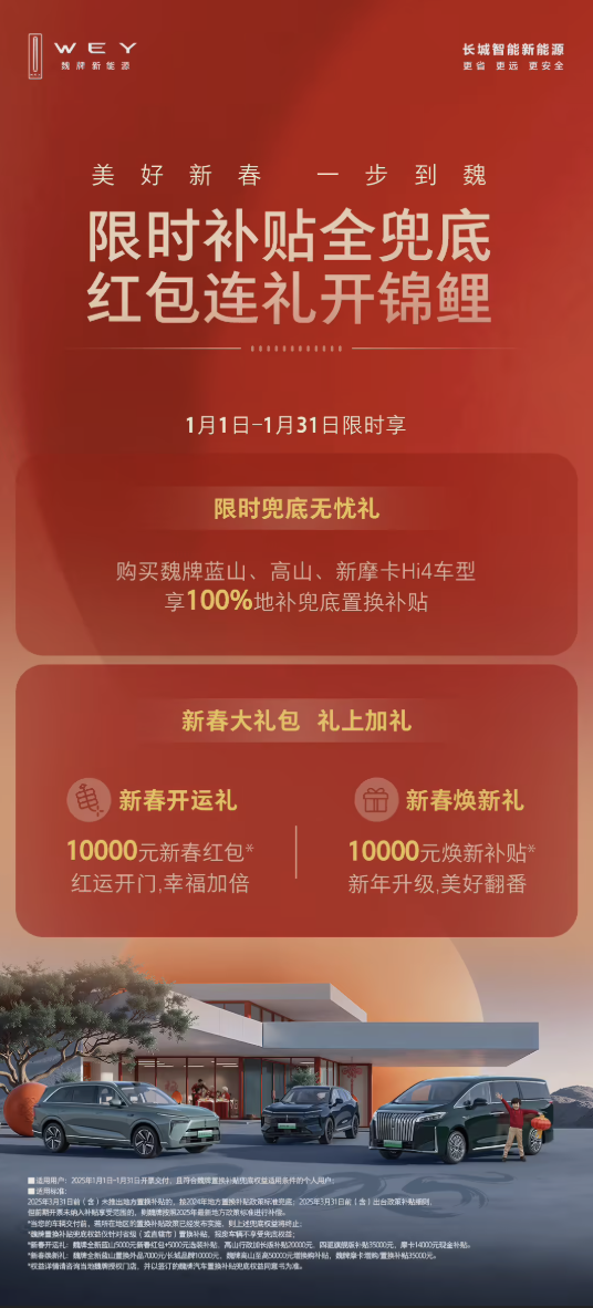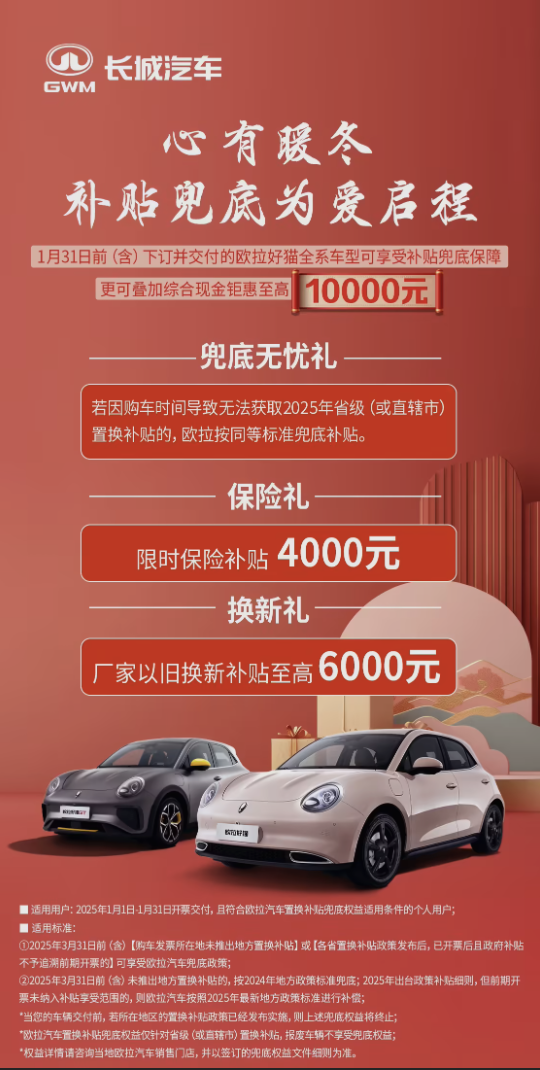 1月7日消息,长城汽车旗下哈弗、魏牌、欧拉、坦克等品牌推出了补贴兜底政策,为消费者提供现金红包优惠、置换补贴、保险补贴等购车权益。