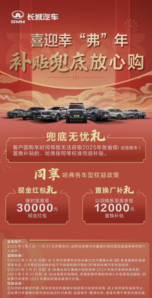 购买长城旗下哈弗、魏牌、欧拉、坦克各品牌车型,在2025年1月1日-1月31日期间开票交付,且符合各品牌置换补贴兜底权益的个人用户。